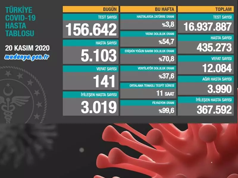 Sağlık Bakanı Dr. Fahrettim Koca "Bugün tespit edilen 5.103 yeni hastamız var. Ağır hasta sayımız 4.000’e yaklaştı. Vefat sayısı 141 oldu Salgınla mücadelede yeniden kısıtlamalar uygulamak zorunda kaldık. Birlikte tedbirlere uyarsak, kendi kısıtlamalarımızı kendimiz koyarsak mücadele daha kolay olacak. Güç verin." mesajını paylaştı.