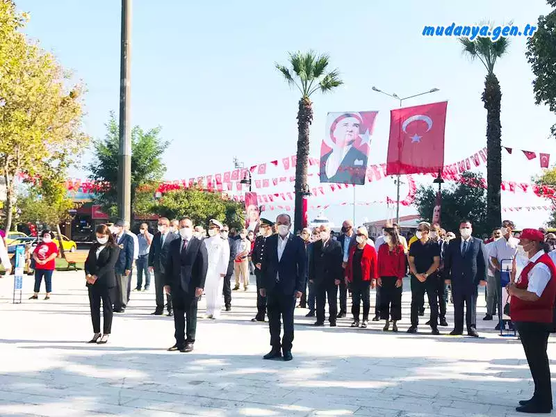 Cumhuriyet Meydanı’ndaki Atatürk Anıtı’na Kaymakamlık ve Mudanya Belediyesi çelenginin sunulması ardından, belediye bandosu eşliğinde saygı duruşu ve İstiklal Marşı okundu. Kutlamalara Mudanya Kaymakamı Faik Oktay Sözer, Mudanya Belediye Başkanı Hayri Türkyılmaz, Baş Savcı Vekili Elif Oğuz, Protokol, Gaziler, Sivil toplum Kuruluşları ve Siyasi Parti temsilcileri ile vatandaşlar katıldı.