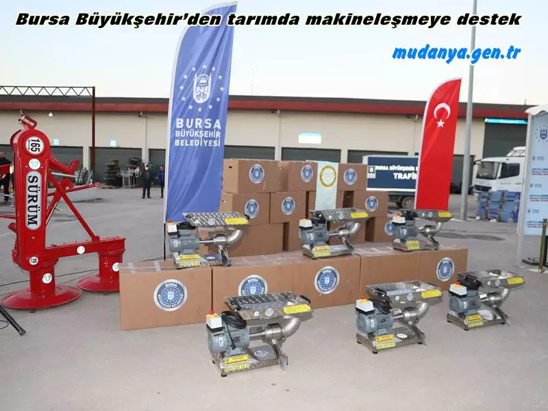 Büyükşehir Belediyesi, ‘Bursa’da üretim kalitesinin artırılması amacıyla’ HAGEL işbirliğinde 10 ilçedeki yüzlerce çiftçinin yararlanması için ceviz kırma, ceviz silkeleme, salça, çilek sırt, dal parçalama, gübre atar çizel, traktör arkası pistonlu çayır ve ot biçme, helezon yem ezme, yem kırma ve taş kırma makine ekipmanları dağıttı.