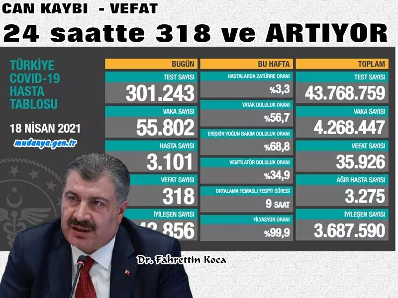 Türkiye'de son 24 saatte 301 bin 243 Kovid-19 testi yapıldı, 55 bin 802 kişinin testi pozitif çıktı, 318 kişi hayatını kaybetti. Türkiye Günlük Koronavirüs Tablosu, "covid19.saglik.gov.tr" adresinden paylaşıldı. Buna göre, Türkiye'de son 24 saatte 301 bin 243 Kovid-19 testi yapıldı, 55 bin 802 kişinin testi pozitif çıktı, 318 kişi yaşamını yitirdi, hasta sayısı 3 bin 101 oldu.