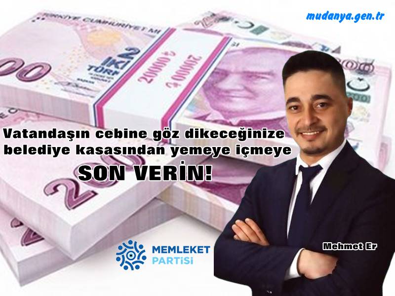 Memleket Partisi Mudanya Belediye Meclisi Üyesi Mehmet Er geçtiğimiz hafta boyunca ilçe gündeminde olan Katı Atık Bedellerinin su faturaları üzerinden tahsili tartışmalarına çarpıcı rakamlarla katıldı. Belediye Başkanı Hayri Türkyılmaz'ın rekor miktarda olan temsil ve ağırlama giderlerine dikkat çeken meclis üyesi Er, "Vatandaşın cebine göz dikeceğinize belediye kasasından yemeye içmeye son verin de tasarruf edin!" dedi. Er alınan mahkeme kararının Başkan Hayri Türkyılmaz tarafından Hukuk Zaferi olarak ifade edilmesini ağır bir dille eleştirdi.