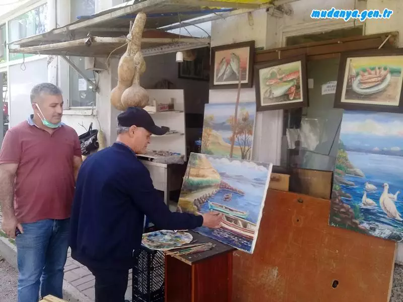 “Çocukken resim yapmak rüyalarıma giriyordu ve yüzlerce resim yapıyordum ve birgün bende hayallerimi gerçekleştirip yaşadığım ilçenin güzelliğini önemli yerlerini resmedeceğim diyordum”diyen Mudanyalı balıkçı, sebzeci sokak ressamı Fahrettin Oktay,” Resim yaparken çok rahatlıyorum ayrıca ortaya bir şeyler çıkardığım içinde çok mutlu oluyorum. Çocukken rüyalarıma giren resim yapma aşkı, lisede temel bilgileri almaya başladığımda “Ben bu işi yapabilirim, zaten resim sevdiğim bir iş olduğu için resme başladım. Yıllarca balıkçılık yaparak denizle haşır neşir oldum, daha sonra sebze meyve satmaya başladım, ama bu arada resim yapmayı da kesinlikle ihmal etmedim. Balık satarken tuvalimde yeni bir resmin boyamasını yapıyordum, bugün sebze meyve satarken yine tuvalimde ki güzel bir Mudanya manzarasını boyuyorum yani resim yaparken çok mutlu oluyorum ve çevreme de hem örnek oluyorum hem de insanları resim yapmaya özendirmeye çalışıyorum. Mudanya ilçemiz doğal bir tuval gibi her yanı muhteşem resim formatında. Ayrıca Mudanya balık cenneti Marmara denizimizde yüzlerce çeşit balık var durum böyle olunca bize de bu manzaraları bu güzellikleri tuvale taşımak kalıyor ” dedi.