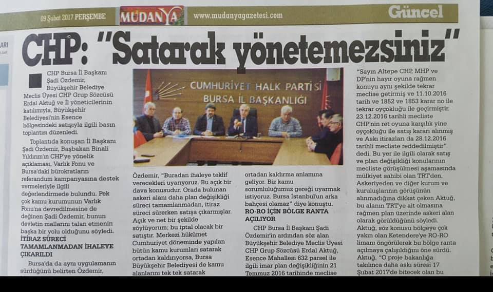 Mustafa AY CHP Bursa İl Başkanı Şadi Özdemir'in Büyükşehir Belediye Meclis Üyesi CHP Grup Sözcüsü Erdal Aktuğ, ile yaptığı " SATARAK YÖNETEMEZSİNİZ " vurgulu basın açıklamasını hatırlattı.